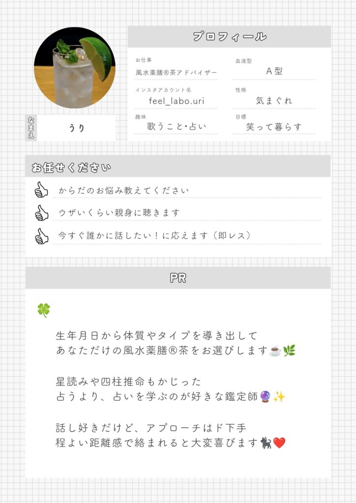 人の健康やペットの健康生活の質をサポート健康・ライフサポート系 犬好きの応援団長ワンちゃんさん ワンちゃんさんInstagramyuko_inu_homecare 風水薬膳®茶アドバイザーうりさん うりさんInstagramfeel_labo.uri 通りすがりのOLセラピストハリミキさん ハリミキさんInstagramharimiki_oltherapist 理容室のりのりさん のりのりさんInstagramsatounorie 占い心のサポート系 ビジネスクリエイティブ系